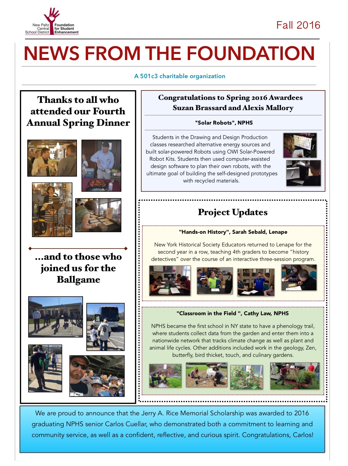 Newsletters and Archives Newsletters 2024 NPCSDFoundation_NewsletterSummer2024Download NPCSDFoundation_NewsletterSpring2024Download npcsdfoundation_newsletterwinter2024Download 2023 npcsdfoundation_newsletterfall23Download npcsdfoundation_newslettersummer23Download 2018 Spring (PDF) 2017 Winter (PDF) 2016 Fall (PDF)Winter (PDF) 2015 February (PDF)Spring (PDF)October (PDF) Past Articles Opportunities for Enrichment New Paltz Times – Inaugural Fundraiser